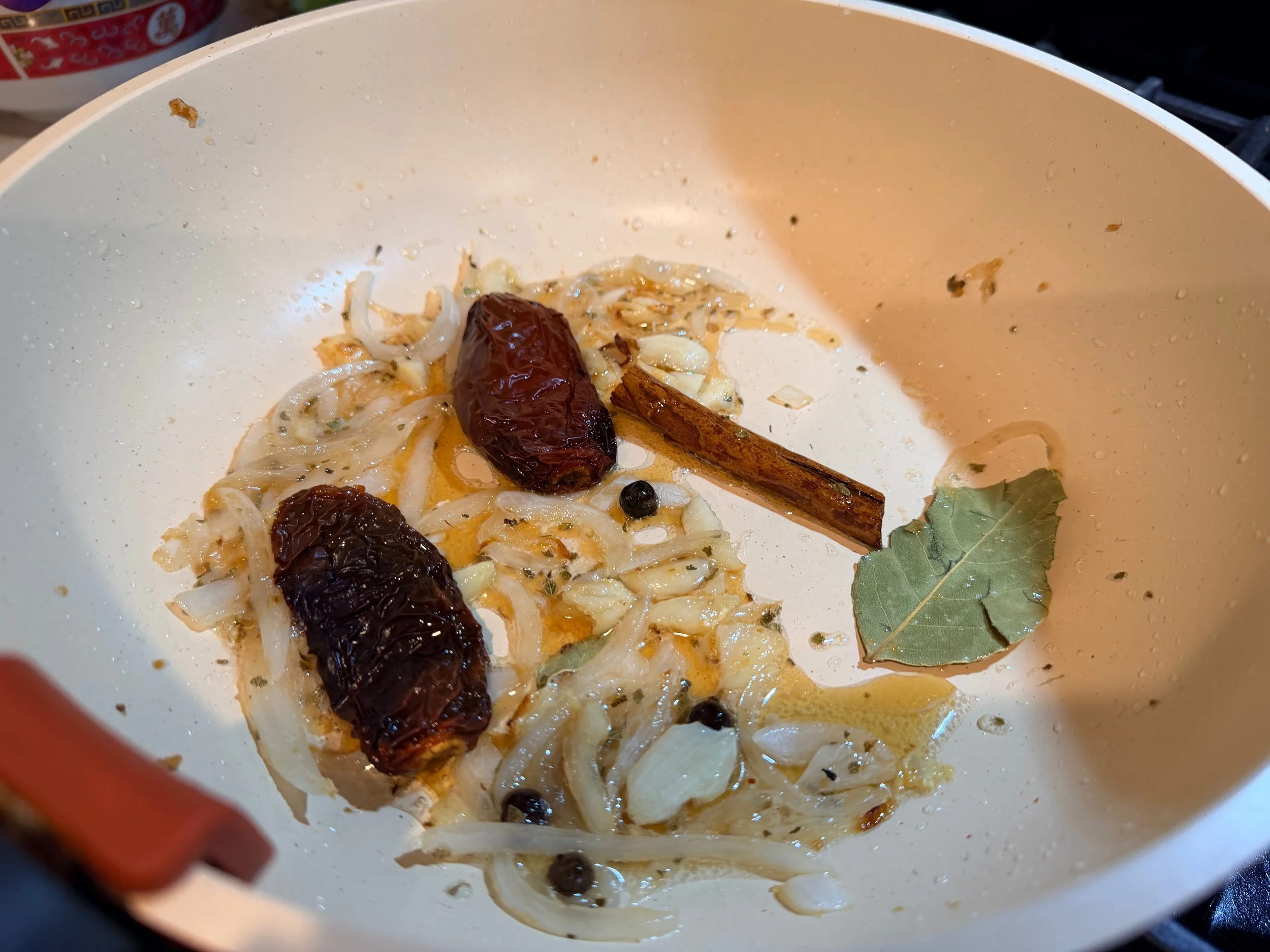 The chipotles escabeche presents an easier challenge, with one notable exception: the recipe never tells you what this is or how to make it. This is a Technical Baking Challenge: I have an ingredient list, and a directive to “make escabeche.” Some quick googling suggests that the unused vinegar and the unexplained “pickle” share a common origin, and that what I am preparing is a sort of Substance. I am a big fan of the Substance category of foodstuff, so this feels manageable. I elect not to sachet the spices, both because I think this will supercharge my Substance, and because I do not own a sachet.