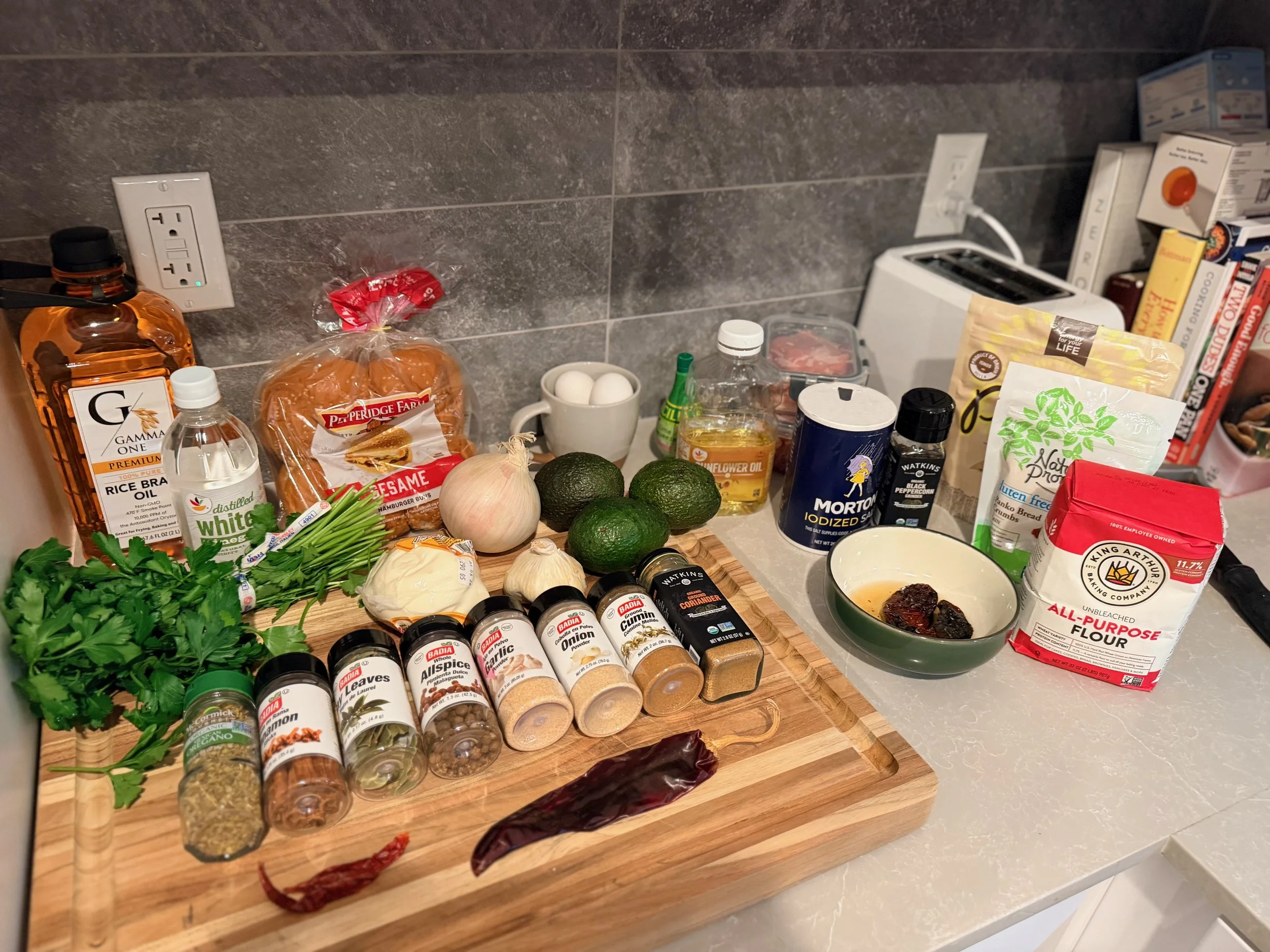 The first sign that this is going to go horribly wrong is that there are 29 ingredients, including fifteen spices and herbs. I turn to the internet for the three types of dried chilis and, for good measure, the Mexican oregano and the rice bran oil; the rest is easy to source locally. By the end of the process, I have spent over $150 on a stunt blog about a ridiculous sandwich.